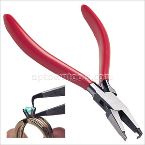 | • PRONG OPENING PLIER WITH SPRING : German-made pliers feature a thinner claw to get in behind prongs. The angle and length of the bottom jaw provides precise leverage to minimize damage to stones. The lower jaw is grooved so that it does not slip sideways on the prong. The claw is made to be filed to a fresh point as it wears. • Box-joint with PVC grips. • A EURO TOOL original. • Length 5-1/4″ (135mm). |