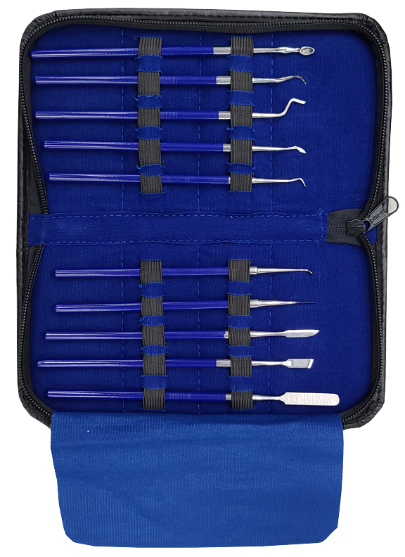 Professional wax carver set. Ten selected high quality single ended carvers, stainless steel. 150mm long, with knurled handles. Versatile tools for many applications: Wax carving, pmc, ceramic, glass beadmaking, etc. Come in a leather wallet. Made in Pakistan.
